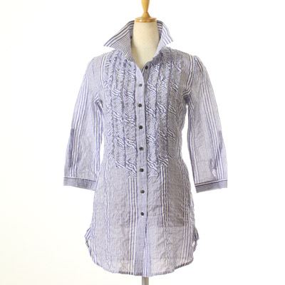 幅の異なる大小のストライプ柄で、胸には共布でのフリルも重なり可愛らしい印象です。